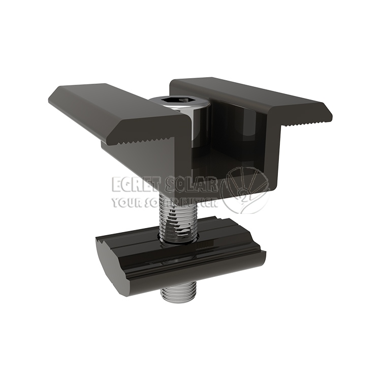 LePinces d'extrémité deAigrette Solaire, comme le bloc de pression intermédiaire, doit être compatible avec l'épaisseur du cadre du composant (généralement 30 à 40 mm), il peut êtrePersonnaliséselon différentes solutions techniques, et il est fabriqué en alliage d'aluminium anodisé pour éviter la corrosion avec le cadre du composant et jouer en même temps un rôle isolant.