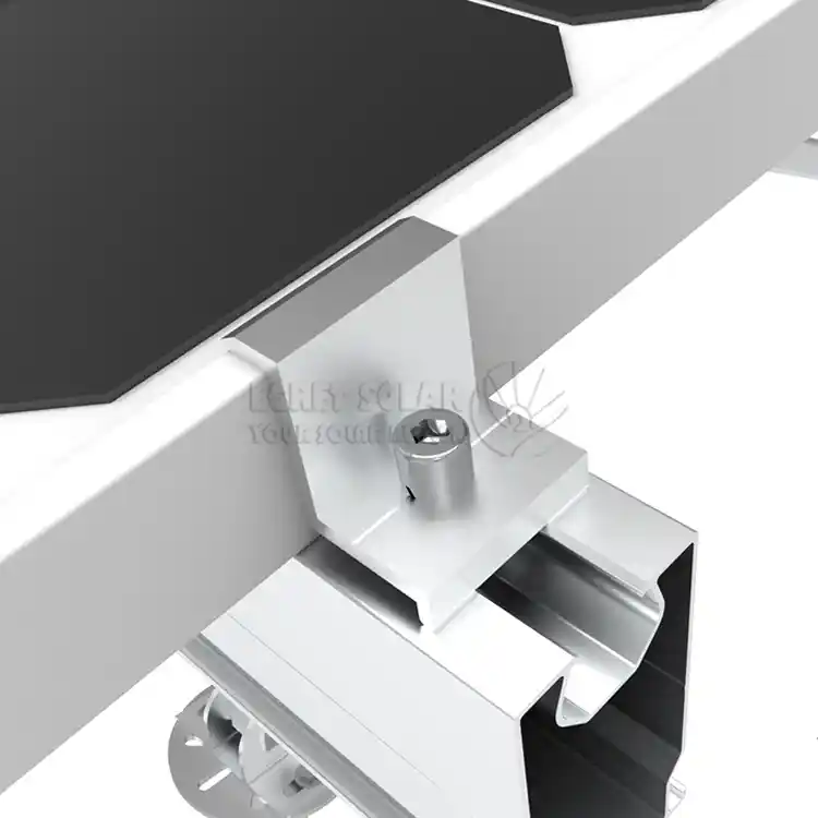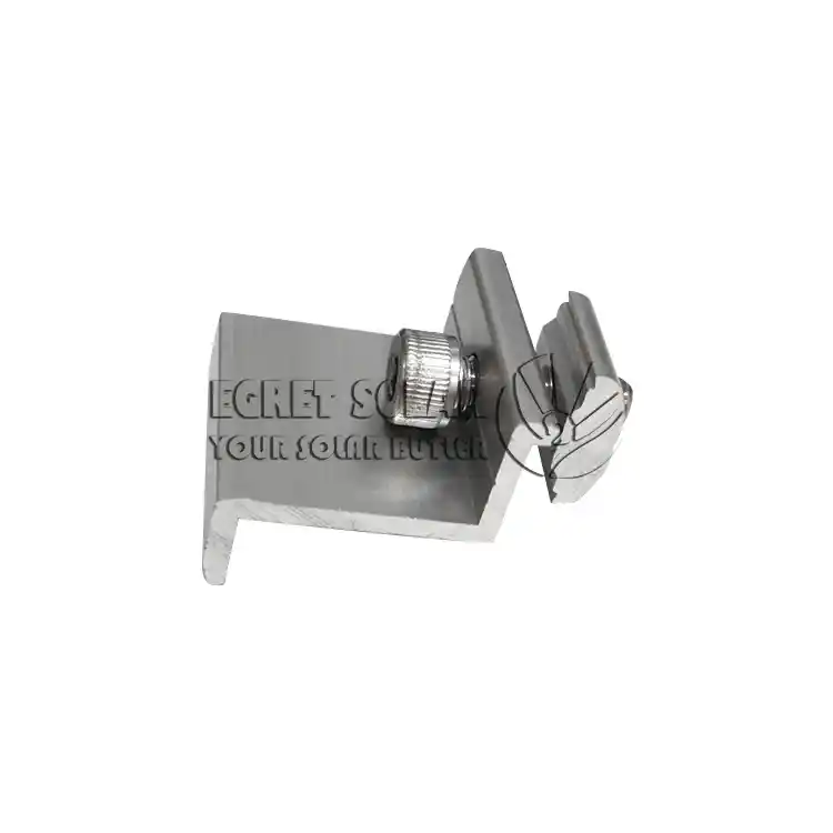 La pince intermédiaire est installée au milieu du réseau et serre simultanément les cadres intérieurs de deux composants adjacents, supportant la force transmise par les deux composants adjacents. Il résiste principalement à la force de levage du vent ascendant. Les deux extrémités de la pince intermédiaire sont ouvertes et servent à maintenir le panneau.